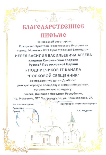 Детская площадка появилась благодаря усилиям настоятеля Благовещенского храма села Степановское 2-го Бронницкого благочиния иерея Василия Агеева, который с помощью подписчиков своего авторского телеграм-канала «Полковой священник» собрал финансовые средства.